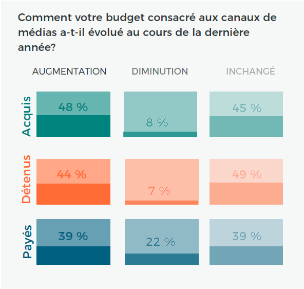 Près de la moitié (48 %) des répondants ont constaté une augmentation de leurs dépenses consacrées aux médias acquis au cours de la dernière année, comparativement à 39 % des répondants qui ont indiqué que leurs dépenses consacrées aux médias payés ont augmenté.