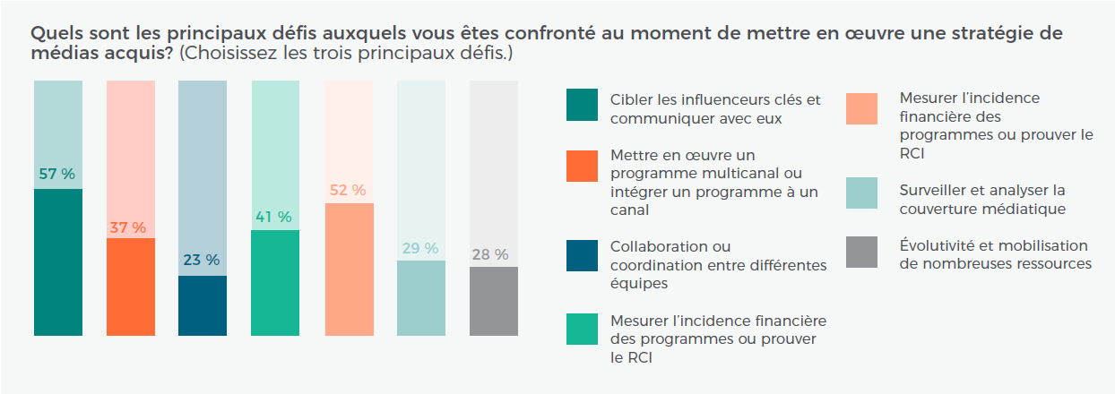 Lorsqu’on leur a demandé quels étaient les principaux défis auxquels ils sont confrontés dans le cadre de la mise en œuvre d’une stratégie de média acquis, 52 % des répondants ont mentionné la mesure de l’incidence financière d’un programme et la démonstration du RCI.